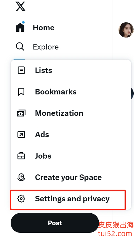 1. 进入设置: 在首页点击左侧的”更多(More)“,选择“设置和隐私(Settings and privacy)”选项。