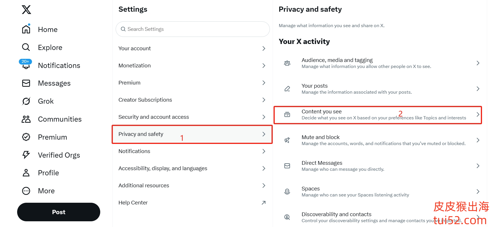 2. 进入隐私和安全设置: 在弹出的菜单中,点击 “隐私和安全(Privacy and safety)”选择”您看到的内容(Content you see)“