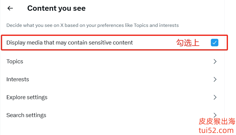 3. 调整内容过滤设置:在 ”您看到的内容(Content you see)“页面,勾选 “显示可能包含敏感内容的媒体(Display media that may contain sensitive content)” 选项。